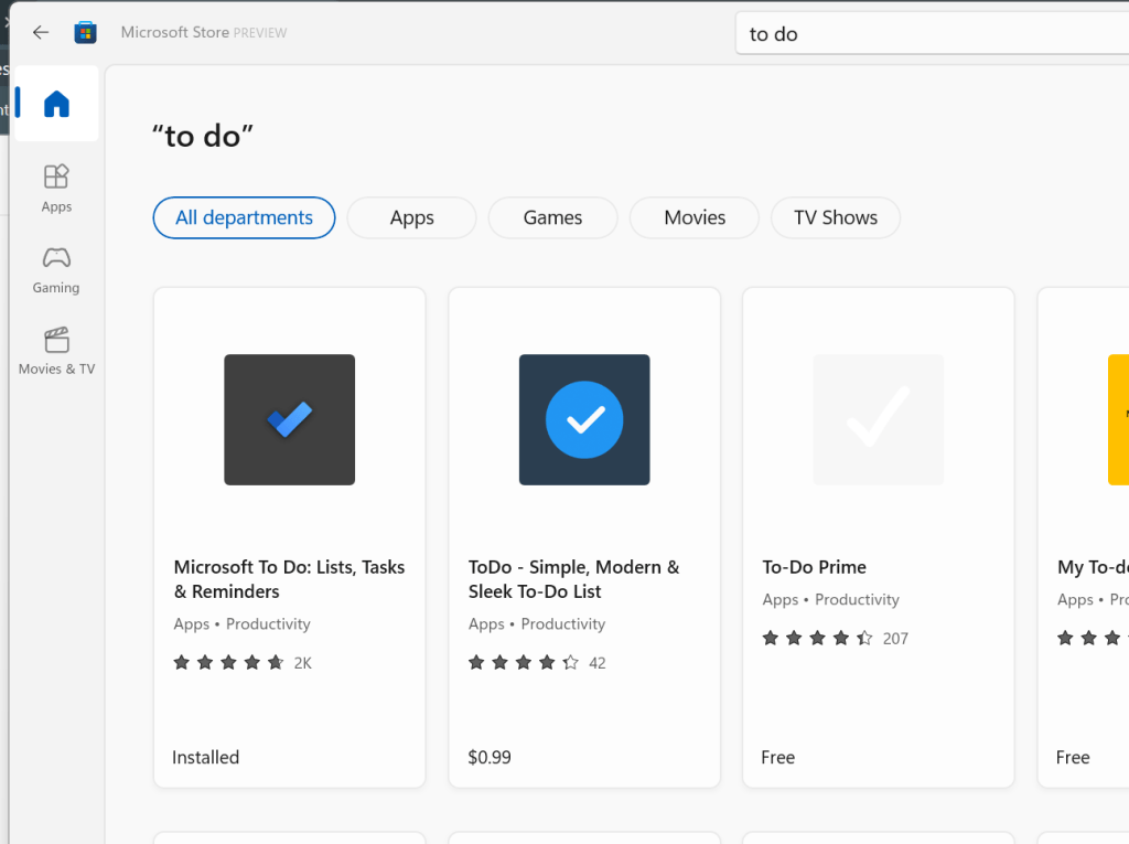 Dejected, I e-trudged into Microsoft Store, resigned to pull some ad-bloated app maybe I could have written myself at one time, and typed: to do.
